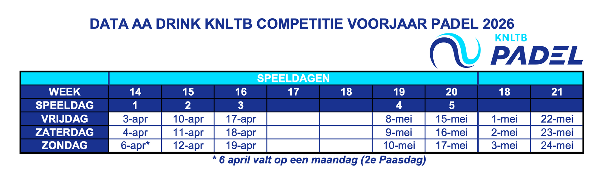 De competitie start in week 14 (begin April) en loopt tot week 20 (half Mei). Zie speeldate hieronder: